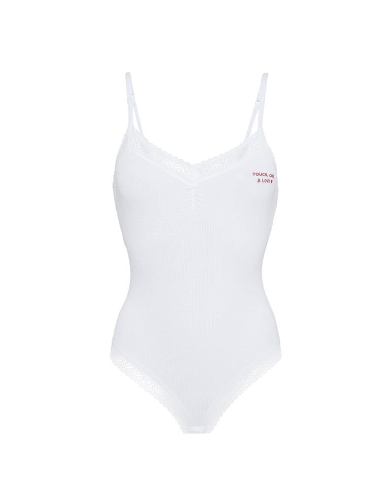 Le body brodé "Touch, Care & Love" se veut à la fois un signe de ralliement et d’empowerment, tout en encourageant à oser se sentir en harmonie avec soi-même.