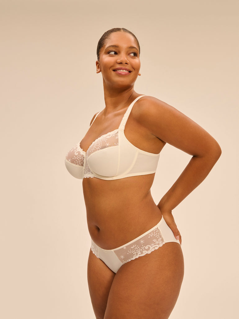 Une broderie florale, sublimée par de délicats motifs en guipure. Emblématique et romantique.