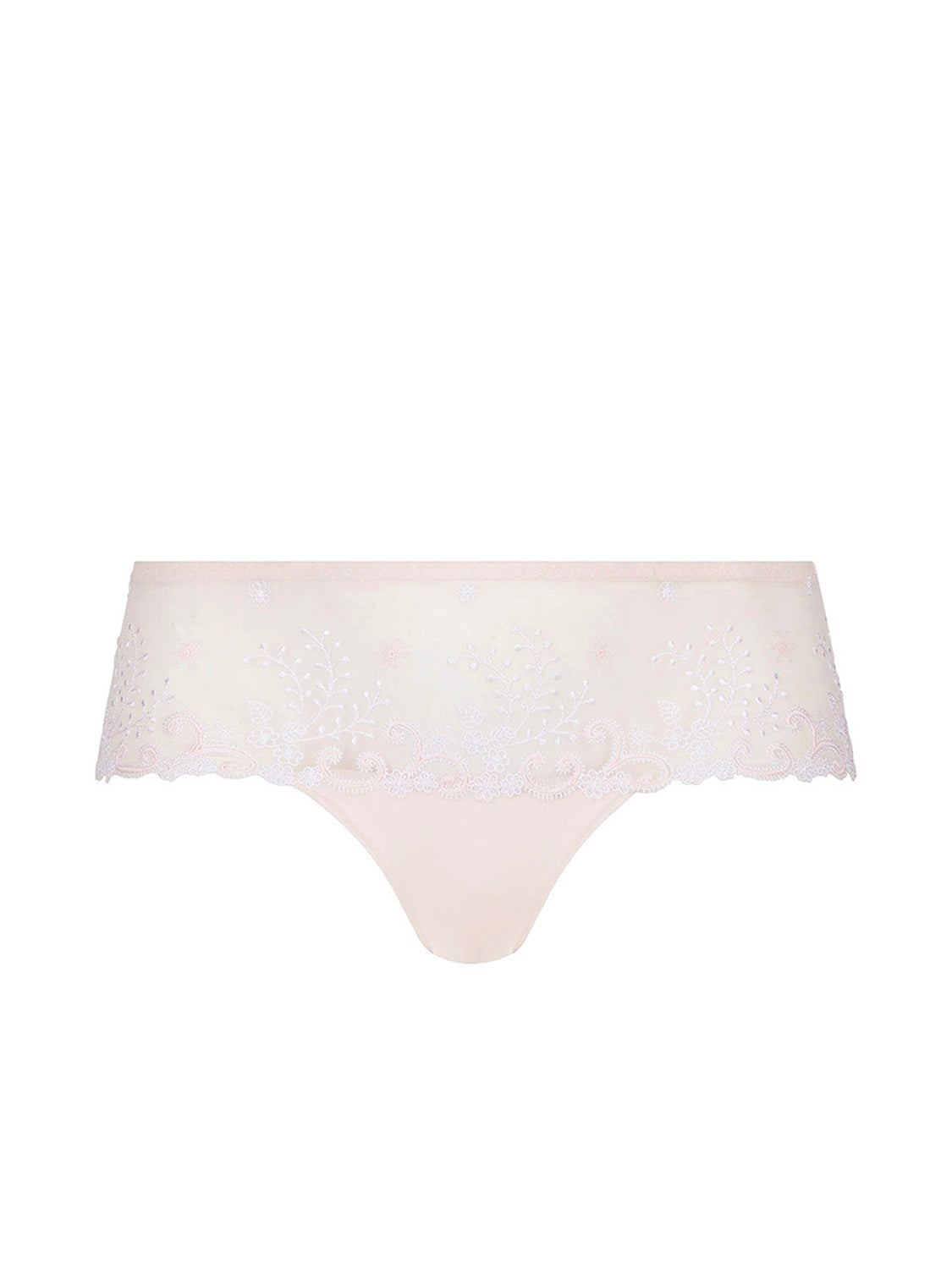 Une broderie florale, sublimée par de délicats motifs en guipure. Emblématique et romantique.