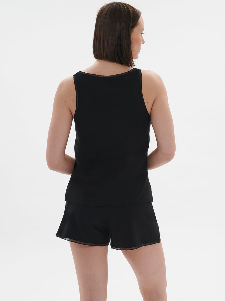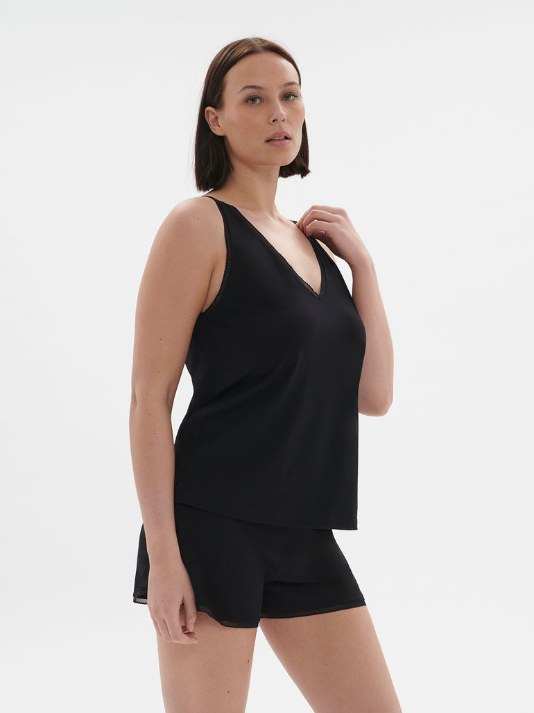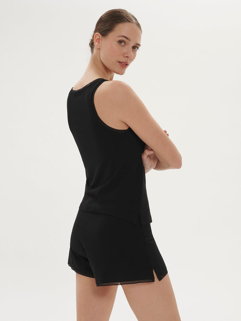 Une maille éco-responsable toute douce mixée à un détail dentelle féminin. Le nouveau basique, à porter du matin au soir.